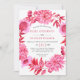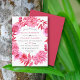 Diese Sommerhochzeit-Einladung zeigt ein ansprechendes Blumenmuster, bestehend aus einem Kranz mit Rose- und Dahlia-Blume und Blättern in Rosa und Rot. Die Rückseite der Einladung ist in einem rosa Farbton gefärbt.