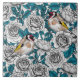 Handgezeichnetes Vektormuster mit Rose-Blume und Goldflossenvögeln. Alle Elemente für das Muster werden zuerst mit Tinte auf Papier gezeichnet, dann in Illustrator neu gezeichnet und farbig.