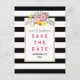 Hübsche, rosa und gelbe Folklore-Blume, schicke schwarz-weiße Streifen und Ihr Text auf einem weißen Rahmen schmücken diese hervorragende Hochzeit Speichern Sie das Datum Postkarte. Wählen Sie es für Ihre Hochzeit im Frühjahr oder Sommer.