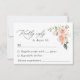Vervollständigen Sie Ihre Hochzeitssaison mit dieser stilvollen RSVP-Karte. Das Design ist in Rosa und Weiß gehalten, die Blume im Wasser und das Grün auf weißem Hintergrund.
