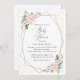 Laden Sie Freunde und Familie stilvoll ein und setzen Sie den Ton für Ihren besonderen Tag mit dieser charmanten Babyparty-Einladung. Das Design zeigt rosa und weiße Aquarellblumen, Grünpflanzen, goldene Konfetti und einen goldenen Rahmen auf weißem Hintergrund.