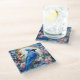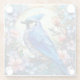 Auf diesem gläsernen Untersetzer sitzt eine wunderschöne blaue Jay in einem hellen Himmelskreis. Der Kreis und der Vogel sind umgeben und überlagert mit pastellblauen, rosa und orangefarbenen Blume und Knospen. Ein Overlay wurde hinzugefügt, um ein farbiges Glas zu erhalten. Hübsch!