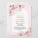 Ein weißer Bogen und ein heller Hintergrund. Rosa Blume und Button verzieren das Zimmer. Ein goldenes Kreuz. Personalisieren und fügen Sie einen Namen und Details.