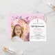 Fügen Sie Ihr eigenes Foto in vertikaler Größe hinzu. Ein rosa bogenförmiger Rahmen aus Foto. Rosa Blume und goldenes Kreuz. Personalisieren und fügen Sie einen Namen und Details.