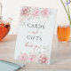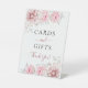 Ein zauberhaftes Blush Pink Blumenkarten und Geschenke Pedestal Sign auf einem ruhigen weißen Hintergrund. Dieses hübsche Schild mit seinen bunten, rosafarbenen Blumenarrangements, zarten Blätter und Zierschriften ist mit dem herzhaften Text "Karten und Geschenke" geschmückt. Danke!" Ideal, um bei jeder Gelegenheit Dankbarkeit auszudrücken.