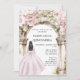 Ein großer Marmorbogen mit rosa Blumen. Ein Mädchen mit einem hellrosa Kleid. Personalisieren und fügen Sie einen Namen und Details.