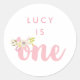 Ein hübsches erstes Geburtstagsaufkleber-Siegel mit dem Wort "eins" in einem rosa Pinselskript-Schriftart überlagerte sich mit einem rosa handgezeichneten Blumenstrauß. Personalisieren Sie Ihre Daten mit dem Namen des Kindes. Perfekt zum Versiegeln von Gefälligkeitstaschen.