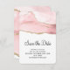Hochzeit speichern Sie die Dattelkarte mit einem eleganten und trendigen Design. Rosa, blaue Wasserfarbe mit einem subtilen Marmoragat-Look und goldglattem Band dazwischen.