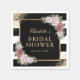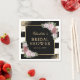 Elegante Brautparty-Servietten aus schwarzem und goldfarbenem mit rosafarbenen Blume und Grünpflanzen, die die Duschdetails in einem goldenen Rahmen mit einem schwarz-weißen Hintergrund mit goldenen Konfetti umrahmen. Die Servietten aus schwarzem Brautparty können Sie ganz einfach online personalisieren.