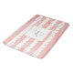 Eine Badematte mit elegantem Muster. Mit rosafarbenen Streifen und Imitaten goldenen Konfetti-Glitzer verstreut herum. Ein weißes Quadrat mit einem goldenen Imitat-Rahmen, der oben mit dem personalisierten Text überlagert ist.