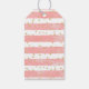 Gastgeschenk Hochzeit Tags mit elegantem Muster. Mit rosa rot gefärbten horizontalen Streifen und Imitaten goldenen Konfetti-Glitzer verstreut herum. Ein weißes Quadrat mit einem goldenen Imitat-Rahmen, der oben mit dem personalisierten Text überlagert ist.