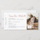 Rose goldfarbenes Logo auf einem lustigen Boarding Pass Save the Date Karte für ein Reisethema oder Hochzeit in Urlaubsort, mit Platz für ein Foto und viel Platz für Reise und Unterkunft Details. Die originalen Retro-Flugzeug-Ticketdetails beinhalten kleine Pfeile, Bar und Box für eine Sitzbelegung in einem Vintagen Schriftart. Hochzeiten in Urlaubsort benötigen alle Informationen über die Unterkunft vor einer Hochzeit. Wenn Sie gewollt haben, während Sie die Reise- und Ausflugspläne erstellen, können Sie das Design auf der Rückseite löschen, klicken Sie einfach auf 'Weitere Anpassung'. Paper Grape Destinations on Zazzle ist spezialisiert auf die Einladungen zum Thema Reisen und Hochzeitsstipendium für die Abenteurer, Wanderlust Pärchen planen ihre Hochzeit im Ausland.
