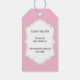Eine wunderschöne Abbildung mit einem bedruckten großen Imitat, einem rosa Satin-Bogen mit einem rosa Herz-Diamant-Inlay-Set vor weißem Hintergrund. Der Rücken als eleganter weißer Rand mit goldfarbenem Jakobsbanner, auf dem Vorlagen für Ihre personalisierte Formulierung stehen. Diese sind ideal für eine Babydusche, Gastgeschenke Hochzeiten aus dem Brautpaar, für Taufen und Taufen sowie für besondere Geburtstagspartys für Damen und Herren.
