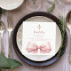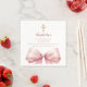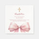 Eine weiße Hintergrundfarbe. Die Einrichtung besteht aus einem großen rosa Bug und einem goldenen Kreuz. Personalisieren und fügen Sie den Namen, das Datum und den Text hinzu.