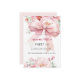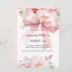 Ein eleganter, weißer Hintergrund mit einem großen rosa Bug und rosa Blume. Personalisieren und fügen Sie einen Namen und Party-Details hinzu. Zurück: Weicher rosa Hintergrund.