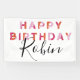 Sagen Sie "Happy Birthday" in fett, farbenfrohen Stil mit diesem personalisierten Banner, das "Happy Birthday" in rosa, orangefarbenen und magentafarbenen Buchstaben mit Ihrer eigenen Namenswahl unten in modernem Stil schwarz Drehbuch. Mit seinem sauberen und modernen Aussehen ist dieses Geburtstagsbanner perfekt für Frauen oder Mädchen, die rosa Liebe.