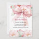 Weiß, mit einem großen rosa Bogen und rosa Blume geschmückt. Personalisieren und fügen Sie einen Namen und Party-Details hinzu. Zurück: pfirsich, cremefarbener Hintergrund.