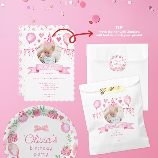 Pink coquette Illustrationen mit preppy Bows, Geschenke, Ballons, Blume und Herzen zu feiern eine weibliche niedliche Baby-Geburtstagsparty