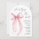 Chic bogenförmige Braudusche mit einer zarten Aquarellfarbe eines leichten rosa Coquette-Bogens, "She's band the knot" in einer modernen Kalligraphie-Schrift und dem Namen und Duschdetails der Braut in einfacher Schrift.