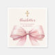 Creme, beige Hintergrundfarbe. Die Einrichtung besteht aus einem großen rosa Bug und einem goldenen Kreuz. Personalisieren Sie den Namen und das Datum und fügen Sie diese hinzu.