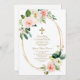 Moderne Blush Cream Bloral Card Design. Es verfügt über prächtige rosa blaue Creme Aquarellfarben Blume goldenen ovalen Rahmen, auf weißem Hintergrund. Verwenden Sie das Tool Personalisieren, um Ihre Informationen hinzuzufügen, um die Hintergrundfarbe zu ändern. Für passende Artikel besuchen Sie bitte meine Kollektion der heiligen Kommunion.