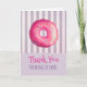 Eine Dankeschön-Karte mit einer leckeren Illustration eines rosa mattierten Donuts mit bunten Sprinklen. Set auf einer schattigen viontage pastellel lila gestreift Hintergrund. Im Text steht: "Danke, dass du so süß bist."