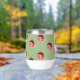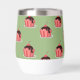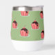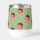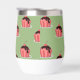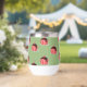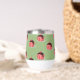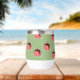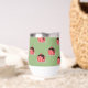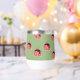 Rosa Eisbecher mit Schokolade und Kirsche auf grünem Hintergrund.