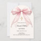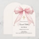 Eine bogenförmige Taufeinladung. Ein warmer Elfenbeinhintergrund, verziert mit einer großen rosa Schleife mit Perlen und einem goldenen Kreuz. Personalisieren und einen Namen und Details hinzufügen.