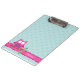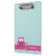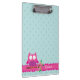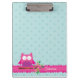 Personalisiertes Klemmbrett, das eine kleine rosa Cartooneule sitzt auf einer Niederlassung mit Grün-Blätter und Blumen des heißen Rosas kennzeichnet. Spaßentwurf für Mädchen, kundengerechten Namen und Aquapunkte.