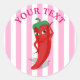 Ein roter und scharfer Pfefferkarikaturencharakter. Originelles Design mit rosa Text und Hintergrund. Diese Aufkleber können als Etiketten auf Gläsern, Flaschen, Geschenkpackungen und vieles mehr verwendet werden! Dekoration für alle Fische, die Sie sich vorstellen können! Weiße Streifen-Version.