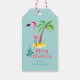 Tropisches Thema Weihnachtsgeschenk-Tag mit einer niedlichen Abbildung eines rosa Flamingo in einer roten Weihnachtsmannmütze. Stehend neben einer grünen Palme auf einem Hang mit gelbem Sand. Ein extravagantes Wirbles Weihnachtsbaumdesign wird neben dem Text Frohe Weihnachten platziert. Geschrieben in der Farbe rosa in einem extravaganten handgeschriebenen Schriftart. Pastellgrüner Hintergrund. Persönlich auf Vorder- und Rückseite.