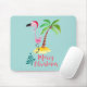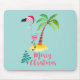 Festmousepad mit einer niedlichen Abbildung eines rosa Flamingos in roter Weihnachtsmannmütze. Stehend neben einer grünen Palme auf einem Hang mit gelbem Sand. Ein extravagantes Wirbles Weihnachtsbaumdesign wird neben dem Text Frohe Weihnachten platziert. Geschrieben in der Farbe rosa in einem extravaganten handgeschriebenen Schriftart. Pastellgrüner Hintergrund.