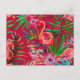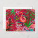 Ein tropisches Design-Kunstwerk aus einem rosa Flamingo und grünen tropischen Dschungel-Pflanze mit Hibiskus Blume und Palmen vor einem dunkelrosa Hintergrund. Ein lustiges und farbenfrohes Kunstwerk.