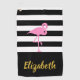 Ein rosa Flamingo erscheint auf den schwarz-weißen Streifen. Unten kann dieses Handtuch mit dem Namen des Empfängers in Imitaten Goldschrift personalisiert werden.