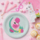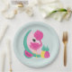 Papier Teller mit einer niedlichen Abbildung eines rosa Flamingo mit einigen Wassermelonen und Ananas. Rosa und grüne Farbe. Summerisch und tropisch. Der Hintergrund ist eine hellgrüne Farbe mit weißen Polka-Punkten.