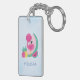 Personalisierter Acryl-Schlüsselanhänger eine niedliche Abbildung eines rosa Flamingos mit Wassermelonen und Ananas. Rosa und grüne Farbe. Summerisch und tropisch. Hellblauer Hintergrund.