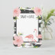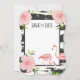 Niedliches kleines Save the Date Druckbild mit durcheinander geratenen schwarz-weißen Streifen und rosa Flamingos und Blume.