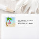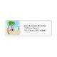 Ein lustiges Thema für tropische Ferien. Design mit rosa Flamingo mit Weihnachtsmannmütze und Kranz, Palmen und Nordpol auf Strandhintergrund.Graphic©http://www.delightful-doodles.com/