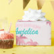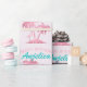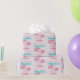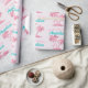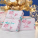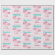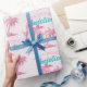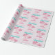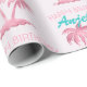 Dieses spezielle Geschenkpapier mit einem Retro-Stil rosa Flamingo Thema. Das Bild zeigt einen Flamingo, der unter einem Palmenhain auf einer tropischen Insel stehend ist. Das Bild hat ein glamouröses rosa Folienmuster mit Glitzer-Akzenten. Ein Muster "Happy Birthday" Gruß wird in hübschem Bubenlegum rosa gedruckt, mit einem personalisierten Namen in einem Vintagen aquamarinen Schriftart gedruckt.