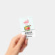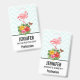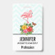 Benennen Sie Abzeichen mit einer niedlichen digitalen Abbildung mit einem rosa Flamingo mit einem Bein erhöht. Stehend auf einem Strauß mit tropischen Hibiskus Blume und Blätter. Ein hübscher Schmetterling schwebt um die Blume herum. Ein hellgrün-weiß Zickzack Muster im Hintergrund.
