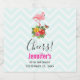 Flaschenetiketten aus Party mit einer niedlichen digitalen Abbildung mit einem rosa Flamingo mit einem Bein. Stehend auf einem Strauß mit tropischen Hibiskus Blume und Blätter. Ein hübscher Schmetterling schwebt um die Blume herum. Ein hellgrün-weiß Zickzack Muster im Hintergrund.