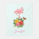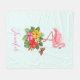 Eine Decke mit einer niedlichen digitalen Illustration mit einem rosa Flamingo mit einem gebrochenen Bein. Stehend auf einem Strauß mit tropischen Hibiskus Blume und Blätter. Ein hübscher Schmetterling schwebt um die Blume herum. Ein hellgrün-weiß Zickzack Muster im Hintergrund.