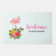Begrüßungstürmatte mit niedlicher digitaler Illustration mit einem rosa Flamingo mit einem gebrochenen Bein. Stehend auf einem Strauß mit tropischen Hibiskus Blume und Blätter. Ein hübscher Schmetterling schwebt um die Blume herum. Ein hellgrün-weiß Zickzack Muster im Hintergrund.