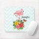 Ein Mousepad mit einer niedlichen digitalen Abbildung mit einem rosa Flamingo mit einem Bein. Stehend auf einem Strauß mit tropischen Hibiskus Blume und Blätter. Ein hübscher Schmetterling schwebt um die Blume herum. Ein hellgrün-weiß Zickzack Muster im Hintergrund.