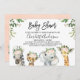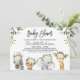 Gemütliche und elegante Safari-Tiere, Baby Dusche Einladung mit vier Dschungeltieren, einige rosa Blumenarrangements und ein bisschen Blätter. Auf diese Weise können die Gäste zu einer Safari-Babydusche einladen. Das gleiche Design ist auch für eine geschlechtsneutrale Babydusche verfügbar.