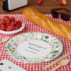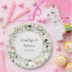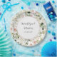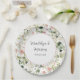 In der Mitte des Rundrahmens sind die rosafarbenen Blume mit grünen Blätter und kleinen weißen Blüten zu sehen. Die Anordnung ist symmetrisch und schafft ein harmonisches Aussehen. Der weiße Hintergrund verstärkt die Schönheit der Blumendetails und macht das Design charmant und raffiniert. Personalisieren Sie mit Ihrem eigenen Namen und Datum.