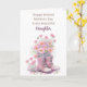 Rosa rustikale Stiefel und Blume Happy verspätete Muttertagskarte für sie, die Sie leicht für den Empfänger personalisieren können, wenn es Ihre Mutter, Tochter, Schwester, etc. ist.