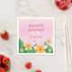 Tropisch rosa Hochzeitstil Thema Papierservietten Design mit Desteis rosa und orange Farbe frangipani plumeria Blume Illustration mit grünen Blätter. Es gibt personalisierbare Textbereiche für die Namen des Ehepaares, das heiraten will, und für das Datum der Hochzeit.