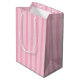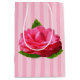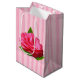 Mittlere glänzende Geschenktasche mit einem rosafarbenen Bild auf rosa Streifen und einer seltenen und prächtigen rosa Gardenie mit üppig grünen Blätter vorne. Siehe passende große Geschenktasche. Siehe die gesamte Sammlung der Muttertag-Geschenktasche in den BESONDEREN TOUCHS| Gastgeschenken