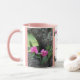 Diese elegante rosa und weiße Tasse zeigt zwei schöne rosa Gartennelken, die im Haken eines Flechte-bedeckten Eichenbaums nestled sind. Der Scripture auf dieser Tasse ist vom Psalm-139:14, die sagt, "ich werden ängstlich und gemacht wunderbar."